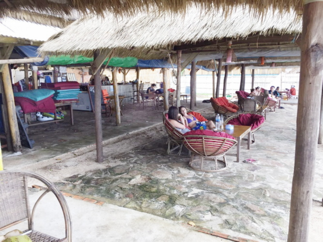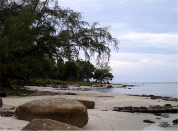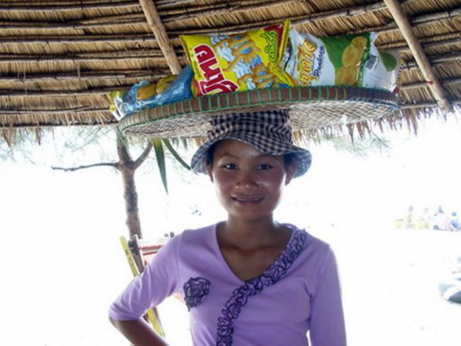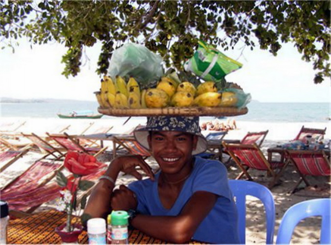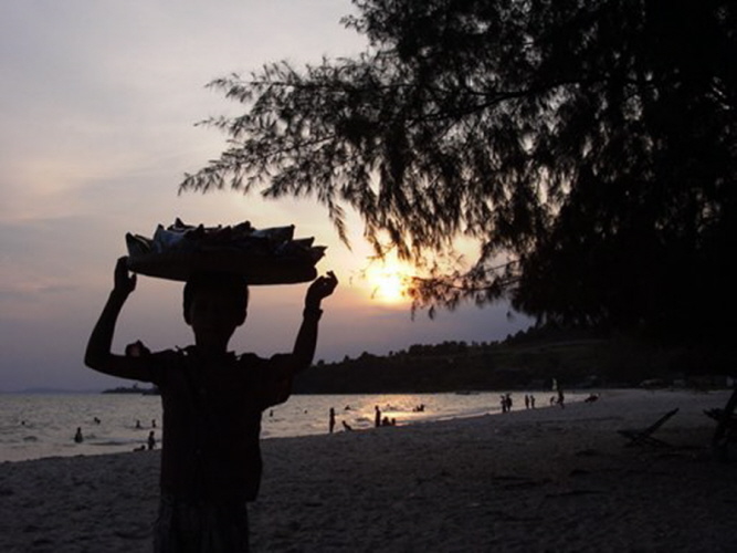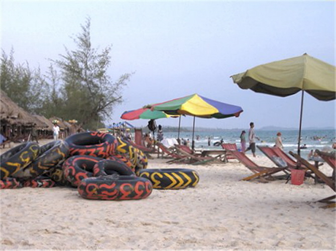 Fahren wir doch ans Meer! Also machen sich Busse, Limousinen und Motorräder auf nach dem 230 km entfernten Sihanoukville am Golf von Thailand, wo das Meer klargrün ist, der Himmel blau und immer eine frische Brise weht. Ab Samstag nachmittag fallen sie in hellen Scharen ein, sogleich muss man ans Meer, wo man sich in einen Liegestuhl fallen lassen kann, der unter einem garantiert sonnendichten Dach steht. Gegrillte Tintenfische, frische Ananas oder irgendwelche Suppen werden vorbeigetragen und helfen, die Zeit zu vertreiben. Danach kommen die Spielkarten raus und es wird gezockt. Die ersten 15 Fotos zeigen wie der Ochheuteal Strand 2002 ausgesehen hat. Heute ist er total kommerzialisiert, Cafe reiht sich an Bar und aufdringliche Verkäufer nerven den ganzen Tag